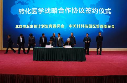 12月26日由北京市卫计委、中关村管委会共同组织的“中关村促进健康服务业发展医企创新合作大会”在中关村示范区展示中心召开,国家卫计委法制司司长张春生、市卫计委主任方来英、中关村管委会主任郭洪等有关领导,以及首都医疗卫生机构、中关村企业、产业联盟、投资机构负责同志200余人出席会议。会上北京市卫计委与中关村管委会共同签署战略合作协议,双方将支持在京医疗卫生机构与中关村健康服务领军企业共同搭建首都转化医学研究平台,期望以临床需求为中心,打破传统的基础研究与临床实践的障碍分隔,加速科研成果“从实验台到病床旁”,促进健康服务业发展。