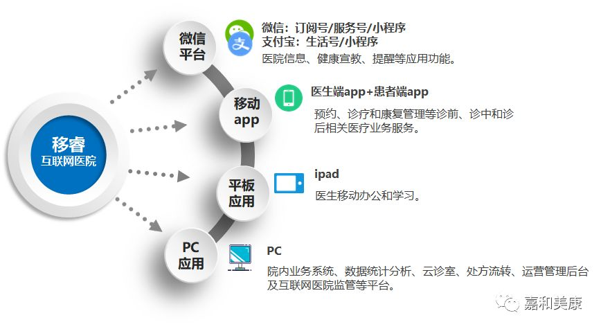 移睿互联网医院,不仅提供标准化的流程和接口用于对接医院各种业务,还支持以多种载体对患者提供服务(APP、Web、公众号、小程序)。